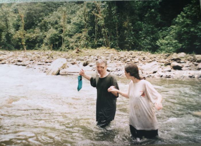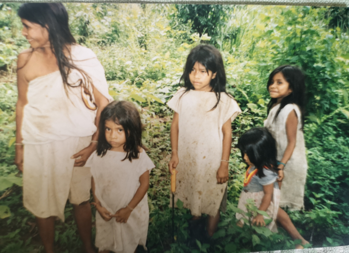 Next stop Santa Marta and Cartagena on the North coast at the Caribbean Sea. The bus trip took a route through San Gil and Baranquilla , with a wonderful high range of mountains, streaked in the evening sun with pinks, greys and browns, that changed as the bus travelled through the panorama. A snaking road ran alongside sheer drops, with worrying small rocks topped with sails, memorials to those who had gone straight on, rather than turning the corner. Most preferred the video and had the curtains closed, despite the free vista . At 3a.m. I was woken and told that we had arrived. "Santa Marta? ", I enquired. It was not. I with 3 a.m. scrambled Spanish, tried to protest that I had booked for Santa Marta. A succession of people became increasingly frustrated with the 'stupid foreigner' adopting the British technique of saying the same thing, but louder. A taxi driver circled sensing a juicy fare. Eventually, I understood that we were in a small town, outside of Santa Marta; it was now 4 a.m. and buses started at dawn. I would reach town by 7 a.m. Santa Marta was a cosmopolitan town which proved to be a gateway to a six-day trek in the Sierra Nevada de Santa Marta, a belt of high mountains leading to the ruins of an ancient Kogi city - Tyrona. I had recently attended a talk by Alan Ereira who had been chosen by the reclusive Kogi on two occasions to warn the world of the damage they were doing to the earth, so this was a golden opportunity . A trip was leaving almost immediately . I prepared with a training course at the bank. The doors opened at 8 a.m. with January sales rush through the double doors. By 9.30 still no money changed. The photocopier was broken, the computer could not be made to work. It seemed that all of the money had been spent on marble floors and columns. I had to find a shop with a photocopier to complete the deal. A motley group of seven tourists set off with a friendly, confident young Colombian guide, Wilson, on a long drive to Chiva. Friendly chatter developed as we walked into increasingly steep and bouldered , rocky mountain paths for 4 hours. We climbed steep slopes and descended into deep valleys with shallow rivers to wade through and bathe in.