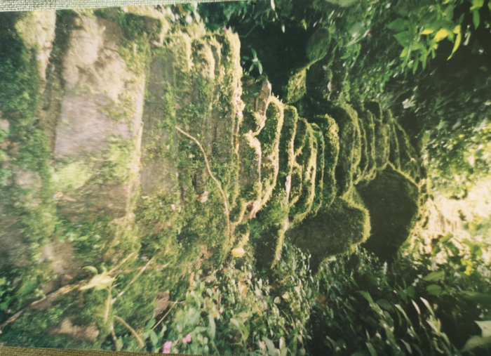 We passed a Kogi man and his wife with their pig. He kept his back to us. At a river crossing we passed two ELF paramilitary soldiers. Human habitation was sparse and we were all grateful to reach a large barn like building, where we were fed and given a hammock for the night. Context began to emerge , ELF paramilitaries, the right-wing militias, linked to big companies, controlled this section, but other guerrilla groups controlled the other side of the mountain. The ELF issue tour permits. Wilson assured us that the Kogi also give permission. An Israeli tourist claimed that another tour guide told him that tours are sometimes used for cocaine runs. Two guides leave, one drops off at the factory, another carries on with the group . Our tired and aching bodies slept easily. More of the same next day, although the walking was less demanding. The rivers were up to 20 metres wide with impressive rapids. More people today; Assario indigenous people in sombreros, Kogi and Awakos , each with their own territories . There were large areas of coca-cultivation and a campesino- owned coke production house. Coca is still the most profitable crop, but the campesino were talking of not growing it next year due to U.S. threats of crop destruction through aerial spraying. The indigenous people would still sell to them . We ended at a Kogi-owned small-holding of one rough-hewn wood building and two open barns. The young Kogi couple had beautiful fine-featured faces, reminiscent of Vietnamese people, but were very shy, though, apparently, happy, to be in company. The one child received loving attention. We were told our first Kogi tales. The Kogi do not want twins and kill one. The reason given was that women do much of the work and can only carry one child. I was not sure about that. Men make the clothes, women embroider them Planting is done by men and harvested by women in line with fertility beliefs. On the third day, we crossed rivers about ten times. I learned quickly that long trousers acted like underwater sails and changed. We were wading up to our thighs and waists. We passed waterfalls, including a spectacular double fall. At one point we had to negotiate a narrow path 20 metres above the river, which sometimes became a ledge. Paula screamed as Eric, an Israeli, slipped and slid five metres on his stomach, ending in an undignified, but unhurt, heap clinging to a tree . We passed several Kogi dwellings and several people on the path. Most were courteous but disinterested in us. Most house occupants were female . As we were told we were getting close to the Cuidad Perdido dark clouds began to gather. We made an undignified entrance. As we climbed the first few stone steps to the entrance, rain began to fall, lightly.