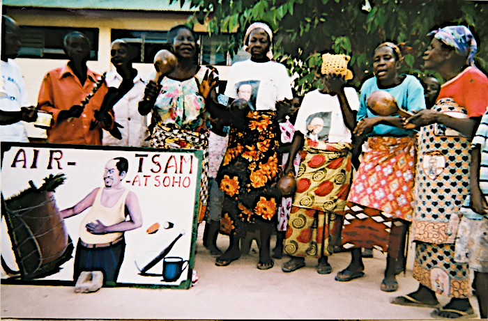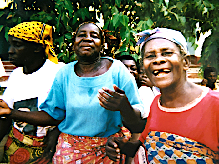 It wasn't a long journey, and I was put down mid-morning on a dirt road with only a few scattered houses nearby. As the bus drove off in a cloud of dust I began to take stock. There was no sign of a guest house, so I began to think about hanging my travel hammock between two scrubby trees at the edge of the small lake. Three teenage boys had watched me arrive and came over talk. One had good English. Following some introductions he said "Where will you stay?" "Oh, I have a hammock, I will sleep down by the lake." He grimaced. "You can't sleep there the mosquitoes will eat you". He came up with an idea. "There are some white people near here, we will take you to them and you can stay there." I checked that it was not too much trouble and we band of brothers walked off happily into the bush. As we walked, I asked them about their lives and the white people we were to visit. They often saw the white people who were their friends. We walked across low undulating hills in wispy grass lands. The sun grew hot towards mid-day making my brow grow sweaty and my bag grow heavier. It became clear that their idea and mine of what was 'close by' lacked congruence. At last, as my water supply ran dry, we came in site of a sizeable house next to a small river. As we arrived a young man appeared at the door of the house, who I recognised as one of the young French people from the bureau in Brazzaville. The boys greeted him cheerily; he had a clouded face. "What are you doing? We told you not to bring visitors here.". The boys looked crestfallen and I realised that this was not a place to stay for the night. As he realised that I was not about to cause trouble he softened and agreed to my request for a drink and rest before we set off on the long walk back to the lake. We spent a cheery time chatting about the fun weekend they were about spend at the hideaway, tractor tube rafting on the river, but at no point was there any offer of further hospitality, so after a while we started the long trek back to the lake and the road in the late afternoon sun. By the time we reached the road again the boys had recognised my exhaustion and helped me to carry the bag. As we reached their small hamlet I asked if there was any accommodation locally. One boy asked me to sit for a while, and he disappeared into a local house. He came back smiling. My father says you can stay for the night. The day ended in a lovely evening with an African family Backpacking Index VSO Index Main Index Off to Owando and on to Odzala National Park I arrived at my next staging point, Owando, as dawn was breaking. The light was silver and the night chill nipped at my body as the first sun's rays warmed my skin. I walked to the centre of the small town where I was stopped in my tracks by one of those rare magical touring experiences. From the large Catholic church across the deserted square wafted a beautiful soprano choral mass in French. I sat down on a step and let the waves of ethereal sounds wash over me. I found myself both tearful and calmed. At the end of the service, I breathed a deep sigh of contentment and began to gather my belongings. Before I could move drums had started in the church which marked the sound of African mass coming from an earthy vibrating source that energised rather than soothed. By the end I felt blessed by the moment of of spiritual emersion in the solitary quiet of an African town mostly made from mud in the middle of Africa, far from home. I rose from my step feeling completely at peace with the world and started off to look for somewhere to stay. As I reached the river bridge people were beginning the round of daily tasks as life cranked up the engine of day. I heard a voice behind me and turned to find a strongly built man in his mid-thirties talking to me in French. He asked where I was going. "Have you registered at the Police station?" His tone was authoritative and slightly threatening. I apologised that I did not know that I had to register and with his status recognised he began to thaw. He showed me a local guest house and waited for me to drop my bags. Outside he told me that there was a local handball (a fast team game like football but with the ball being thrown and caught by hand). We walked to the local field where a game was in progress. Athletic young men ran, shouted, argued and celebrated as the ball flew into the goal. At the end of the match my now friendly policeman excused himself as he was the referee of the next match on an adjoining pitch. I watched the match from a distance. It was an ill-tempered affair that blew up into a heated dispute between my policeman friend, the referee, and an aggrieved player. From a distance I became aware of how much the pair looked like a pair of barking dogs. First, they came close to each other barking, looking as though blood must be shed, then my policeman turned his back and walked a few steps but turned back and barked again before walking back towards me. By the time he reached me he was back in good humour, and we greeted before separating to go our separate ways. The next day was the day of the local dance festival of the year marking a public holiday. It seemed that local groups came together in their neighbourhood to dance together close to their homes.