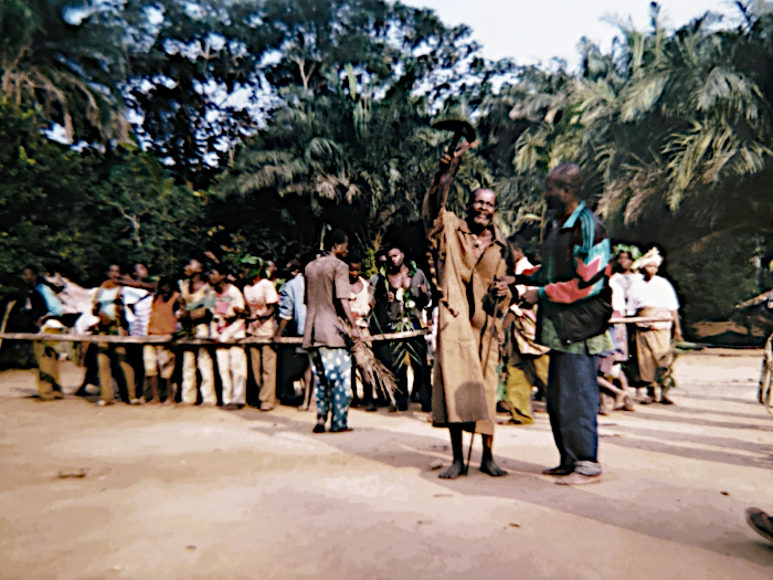 I felt like a child leaving home when my two days in the luxury of the manager's house came to an end and I moved into the cabin for the six tourists allowed in the vast park at any one time. Four were just leaving and were very enthusiastic about their experience. We spent an enjoyable evening together and I met with my travel partner, a young American woman from New York who whilst friendly was reserved and had booked a visit having read about Odzala in National Geographic. We rose early next day to be introduced to our local guide who was to accompany us up the River Lekoli to the northeast boundary of the park. The guide spoke only French, and my companion spoke no French at all, so my smattering of schoolboy phrases was our only unreliable form of communication. We were seated comfortably in a wooden pirogue (canoe) with an outboard motor. We were quickly in dense tropical forest with majestic, often huge girthed, forest trees and no obvious human habitation save the occasional small patch of palm trees showing that people had been there. As we travelled for more than two hours large drops of rain began and I huddled under my thick waterproof army surplus camouflage cape, which was like a steam bath in the dense hot and humid air. We came under attack from Tetsi flies which are the worst insects I had ever come across. Exited by the promise of our blood they kept up intensive sorties. Even my thick cape could not always keep their proboscis at bay. They could penetrate the cape and, if it lay close to the skin, land a strike that felt like a red-hot needle. After more than two hours we arrived at our land destination and sharing out the camping gear and food started up a forest path across more open scenery. We walked for nearly an hour in jovial mood and our guide said that we were nearing our campsite. We turned a bend in the path, moving into open ground, and stopped dead in our tracks. There in front of us, no more than eight metres away, stood a huge male gorilla carefully and delicately picking berries from a bush. We were transfixed by this wonderful full-grown creature oblivious to our presence. It seemed a long and profound time that we watched but must have been less than a minute before he turned his head and registered us with what seemed like a look of shock. He let out a huge scream. I turned to run in panic. "Arrette" the guide barked and I froze. The gorilla was more frightened than us and hurried away into the undergrowth beyond the bush emitting chilling shrieks along the way. We exchanged excited grins along with unbelieving expressions of astonishment. As we were to learn later, lone gorillas were the result of a challenge by a young male to the group's silverback leader. When defeated the looser was pushed out of the group to live alone. Even at this size and power some succumb to the ferocity of leopard attack. We reached camp after a short time, ate and slept. The following day we breakfasted early and set off silently in single file through the forest. At last, we came to the edge of a large clearing covered in green herbs and grasses. There in the middle distance was a huge bull elephant surrounded by bush pigs, bongo, sitatunga and a multitude of smaller animals. Closer, a stream exploded into life as crocodile flew into a murderous spasm, ending the life of smaller creature. Suddenly, the huge bull elephant reared up on its hind legs and spun round and round several times before lumbering off away from us at high speed with its entourage of smaller beasts in tow. There was a more tranquil period in which grazing animals quietly went about their business until we noticed a troop of forest elephants had started to move slowly towards us. We wondered what would happen, but their path took them to the edge of the forest maybe 100 meters to our right and they disappeared into the forest. Our guide explained that elephants had a very keen sense of smell, and he surmised that the bull had smelt our presence. After a short period of gazing, we were interrupted by a crashing sound behind us. As we turned our heads a baby forest elephant emerged from the forest behind us followed closely by its mother. The troop had circled round the forest to enter the clearing again just where we were settled. At this point as we went numb our guide did the bravest thing I had experienced. He jumped up in front of the mother waving his hands and shouting. To our relief the startled troop panicked and fled back into the safety of the forest. We retreated back to camp where our guide received his hero's approbation. Backpacking Index VSO Index Main Index We were fortunate that a young boy of the Lossi tribe was to undertake the circumcision ceremony during our stay. This rite of passage involved a mixture of endurance, magic, dance and feasting in a remote forest village. When we arrived, it was already heading towards dusk and the humid, saturated day was yielding to the chill of the evening. We were shown our basic accommodation, and I greeted one of our base camp cooks who had arrived home to join the celebrations. I noticed that two dry trees had been lain side by side with charcoal alight along the length in the groove formed by the trunks, an ingenious way to keep everybody warm. A tired and distracted young man in his mid-teens was walking around the long thin clearing accompanied by two older male companions. He was not allowed to sleep until the circumcision had taken place. To aid him chilli powder was rubbed into his eyes from time to time. It was their way to transport him into an exhausted trance state ready for the pain to come. He was not allowed to shout or scream through the ordeal if he was to be accepted as a man.